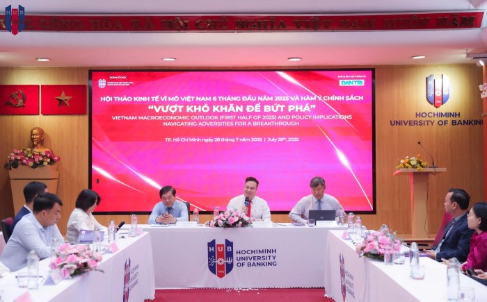 Sáng ngày 28/07 Trường Đại học Ngân hàng TP. Hồ Chí Minh (HUB) đã tổ chức Hội thảo khoa học với chủ đề: Kinh tế vĩ mô Việt Nam 6 tháng đầu năm 2025 và hàm ý chính sách: VƯỢT KHÓ KHĂN ĐỂ BỨT PHÁ nhằm phân tích sâu sắc bức tranh kinh tế toàn cầu và Việt Nam trong nửa đầu năm 2025, tập trung vào các chỉ số then chốt của nền kinh tế như tăng trưởng, lạm phát, điều hành tiền tệ – tín dụng, ngân sách, và nợ công,… Đồng thời, cũng đưa ra các kịch bản kinh tế vĩ mô cho 6 tháng cuối năm 2025 – làm cơ sở quan trọng để hoạch định chính sách ứng phó với mọi tình huống.
